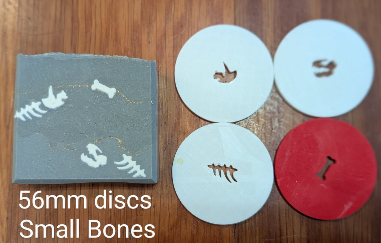 - 56mm - Small Bones: These discs will create the same small fossils as the 18mm size, but without the need to assemble them. You will also need a large soap dough extruder that is compatible with the 56mm discs in this set. They can be purchased from several suppliers, but my personal favorite is this one from I Dream in Soap in the UK.