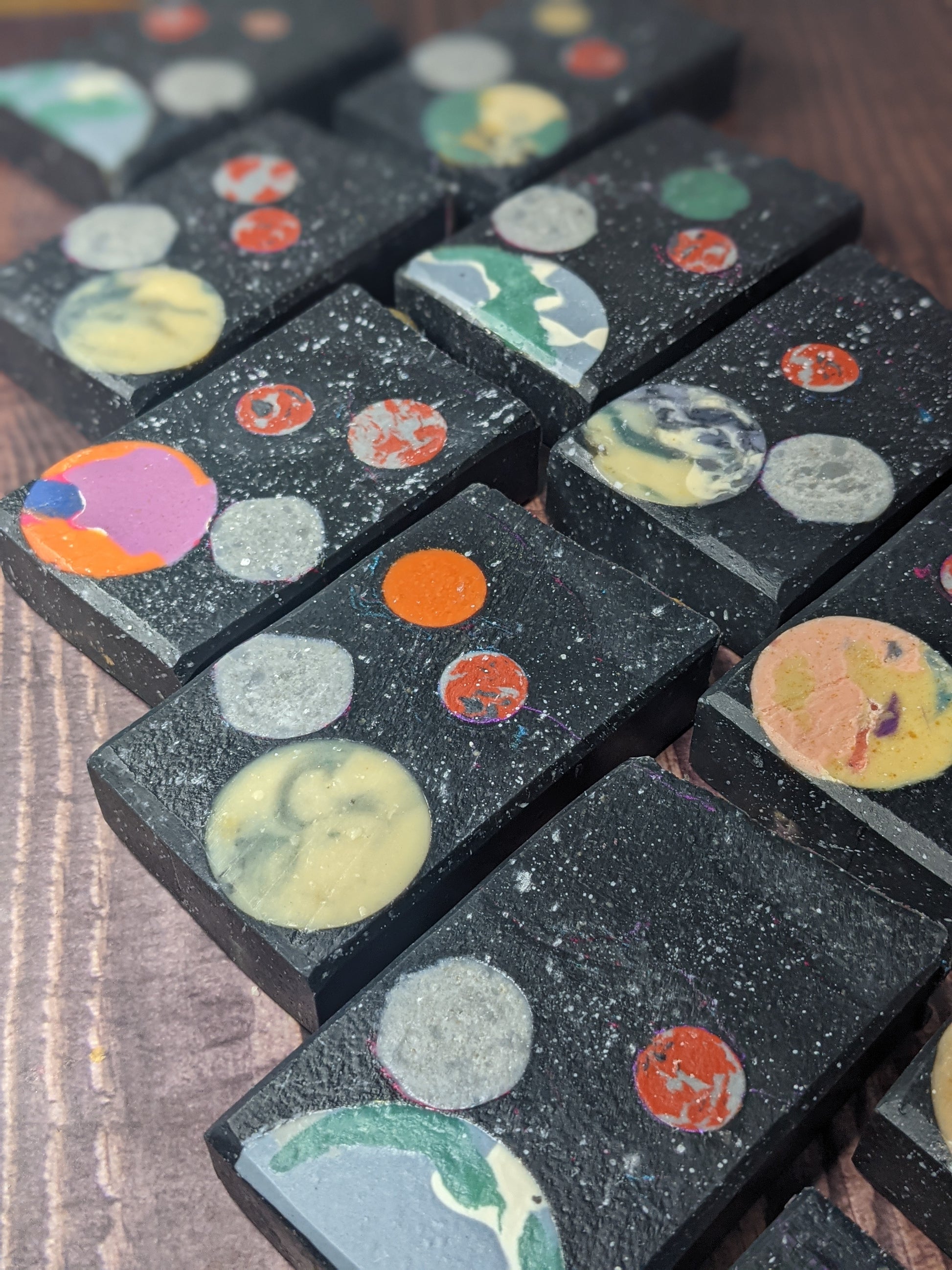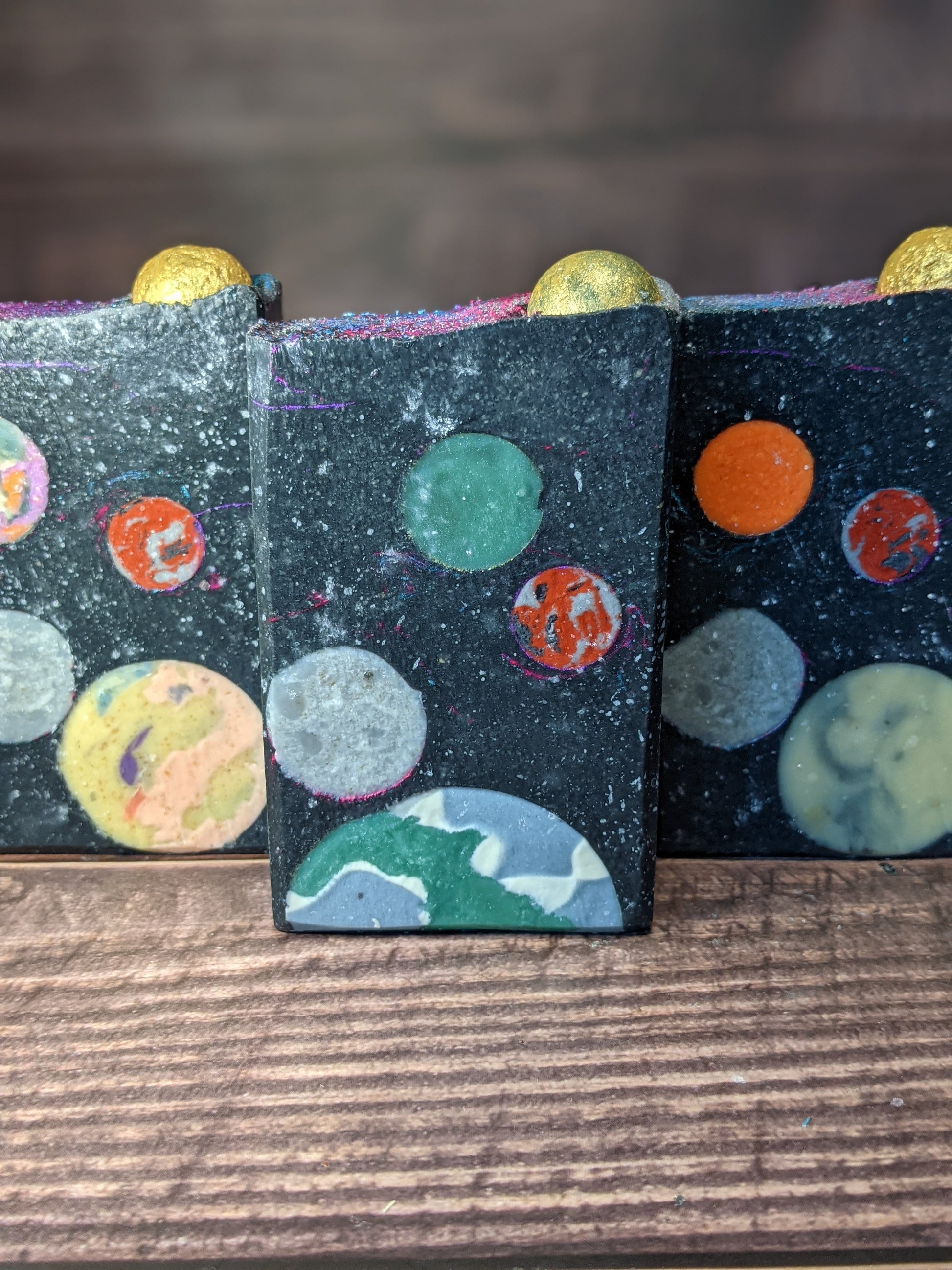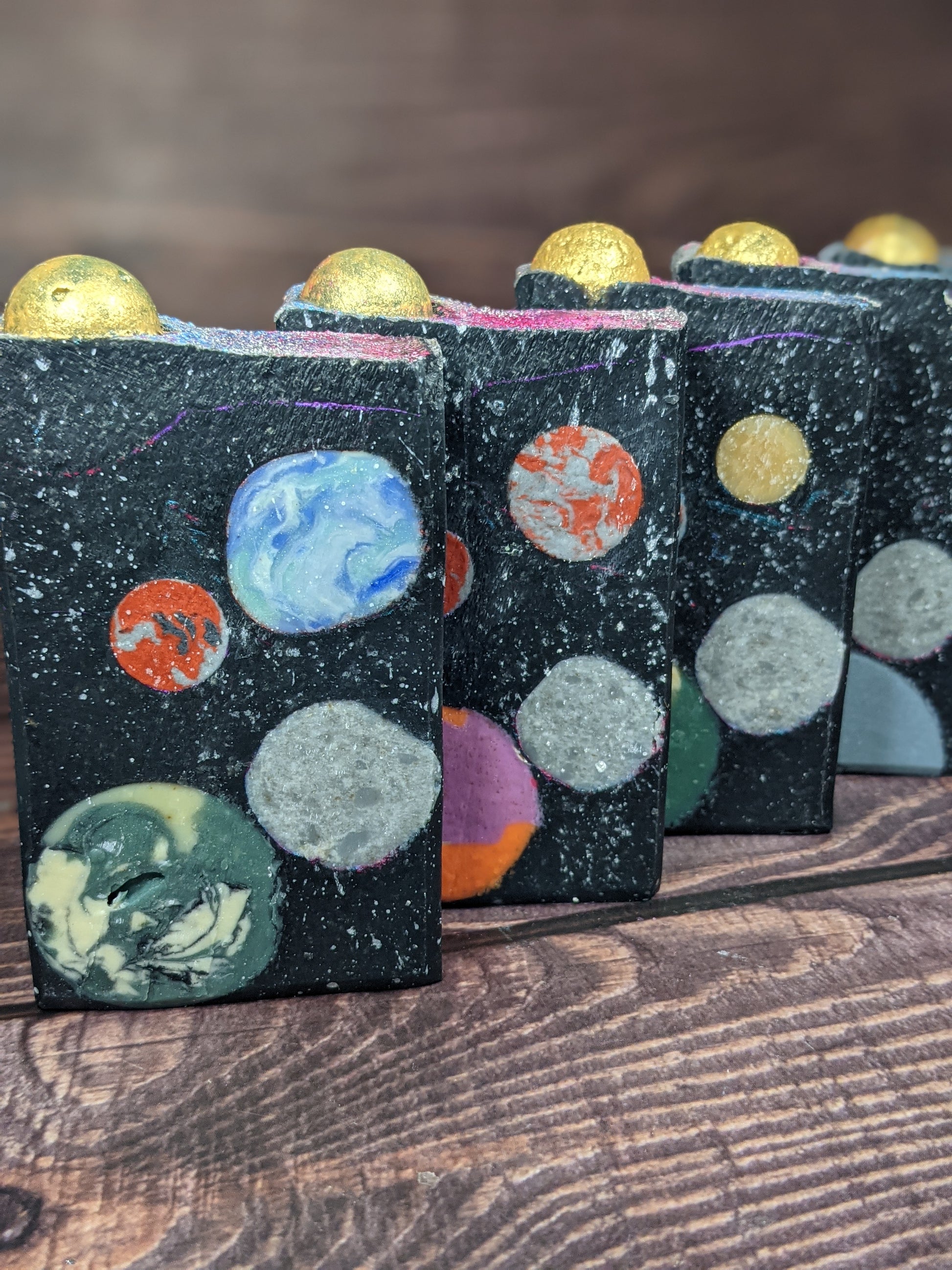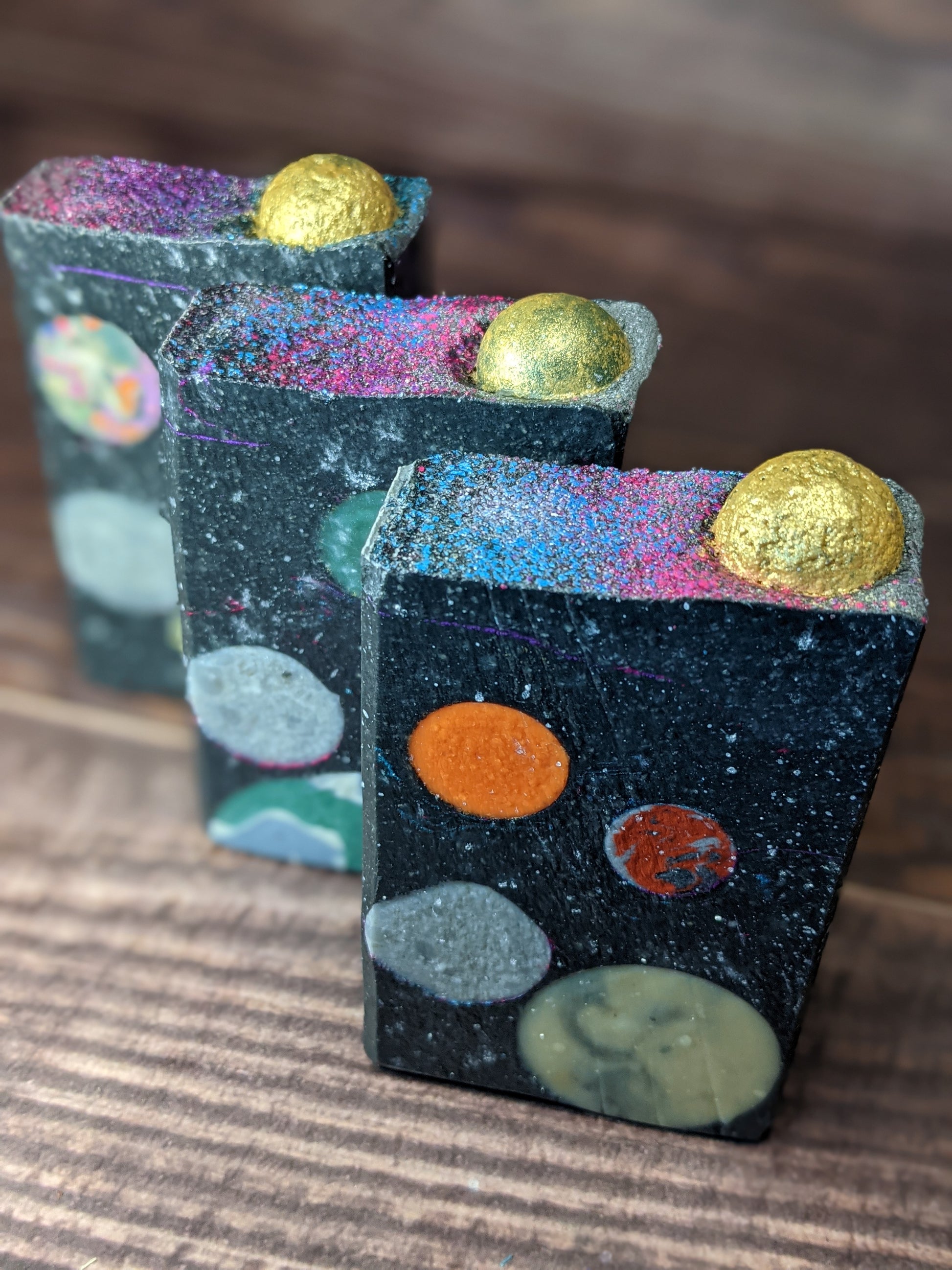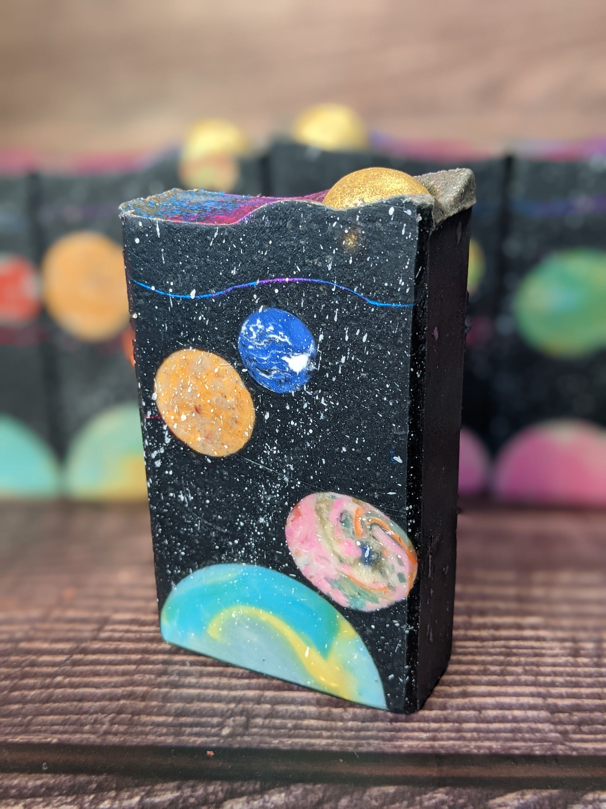 Travel to the stars with Galaxy Grape! This handmade goat milk soap looks like outer space itself, with planets that are out of this world. Enjoy the smooth, rich lather of this soap and the cosmic grape scent, sure to make you feel out of this world! Every single bar of Galaxy Grape is different and unique, so you never know what color of planets and stars you'll receive.