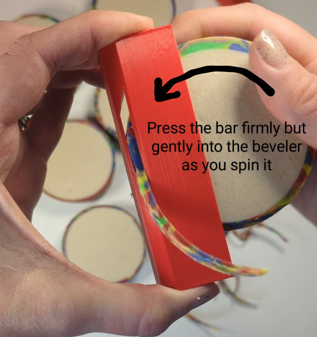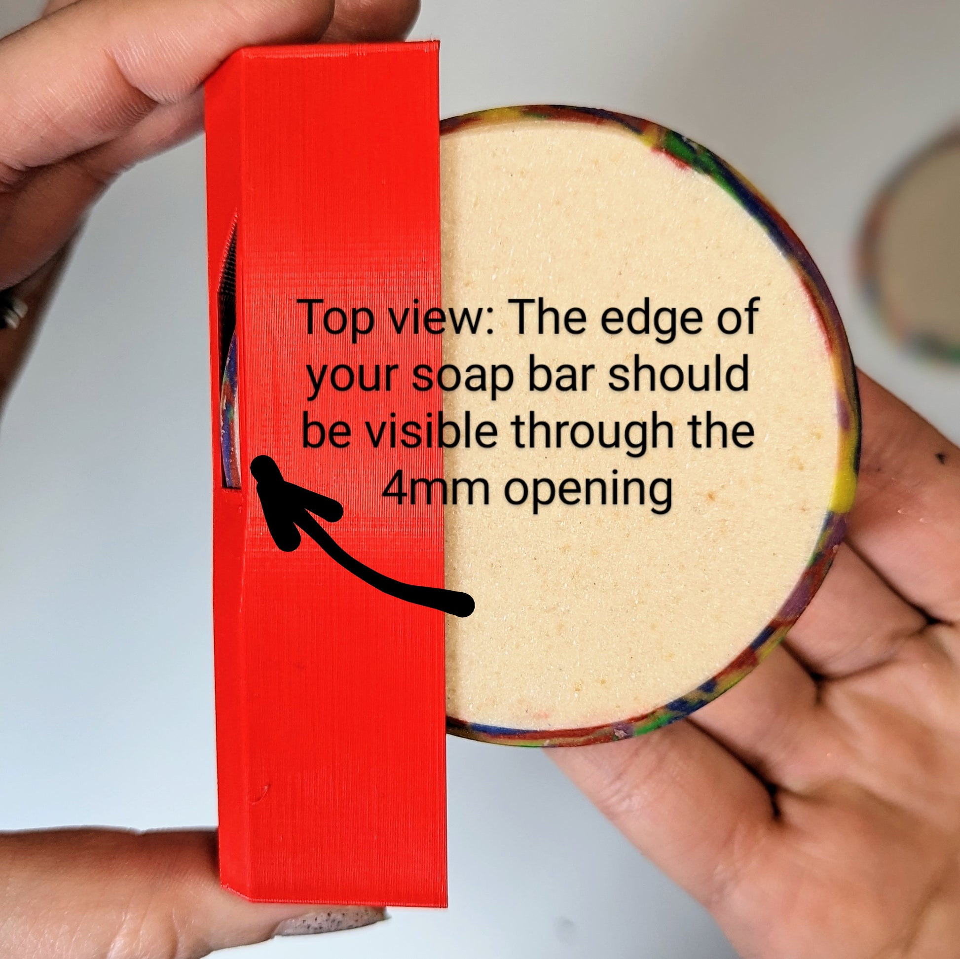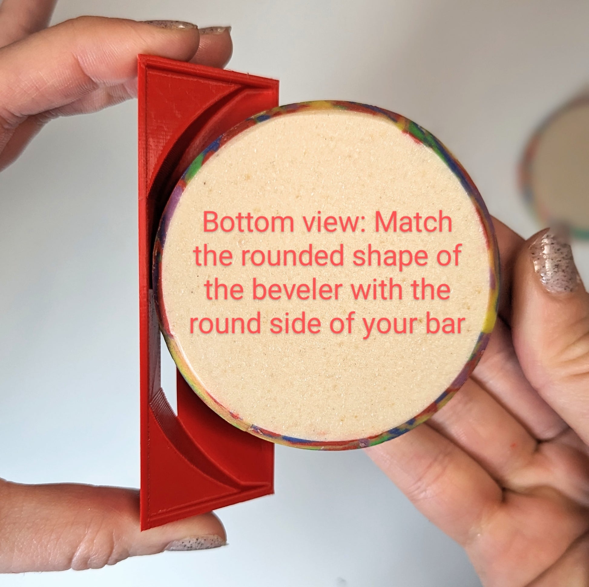 To Use: Place the beveler over the edge of your soap, matching the rounded shape of the beveler to the round side of your bar. The raw edge of your soap should be visible through the 4mm opening. Use firm but gentle pressure to slowly spin your soap in the opening as the cutting edge trims away the sharp edges of your bar.