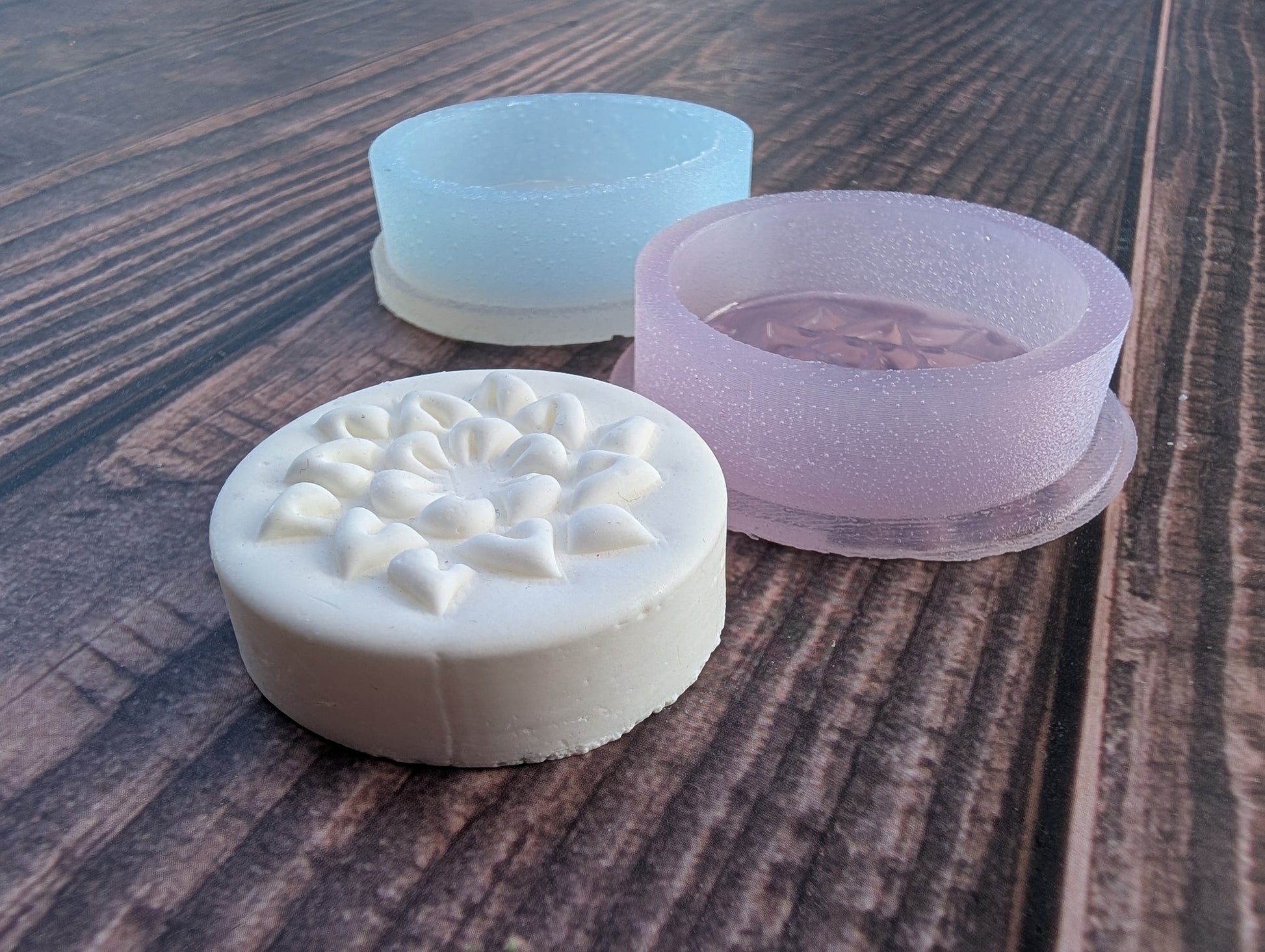 "Round Flower" Mini Mold creates bars that are 1.75" diameter x .5" tall, and they weigh approx. .7oz (19g)